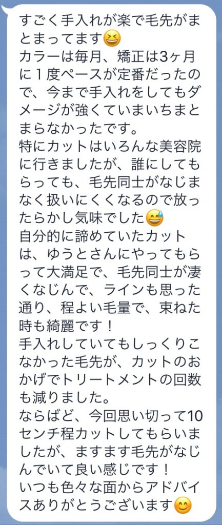 お客様の声&口コミ No.9 2017.11.19 BLOG お客様の声 こんにちは、美容室ELENAのYUTOです! お客様から毛先のまとまりが良くなったとのメッセージを頂きました✨ M.S様 30代 ELENA-エレナ- YUTO お客様の声&口コミ No.8 前の記事 お客様の声&口コミ No.10 次の記事